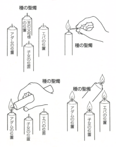 ③種の聖燭は天の父母様の位置に、3本のろうそくはアダム、エバ、子女の位置に立て、四位基台の形を作ります。